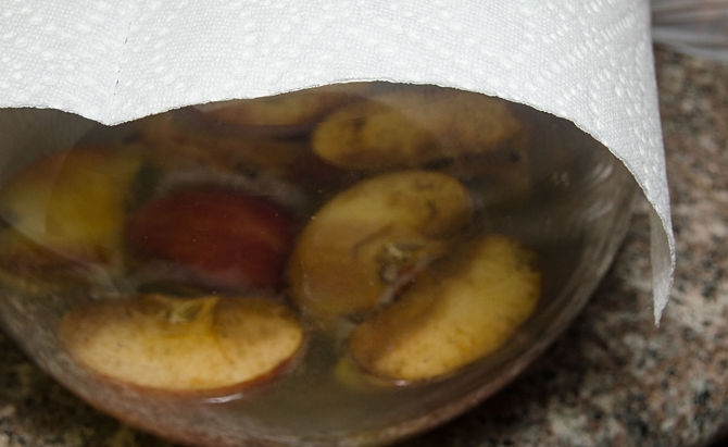 5- ثم قم بصب الماء داخل الوعاء حتى يغطي قطع التفاح تماما.